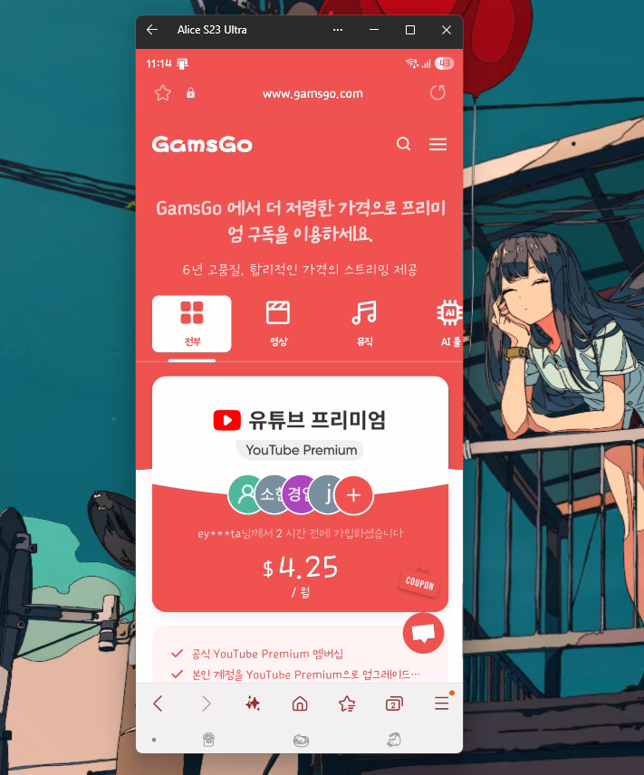유튜브 프리미엄을 기준으로 비교해 보면, 겜스고에서는 월 5천원대에 이용할 수 있는데요.