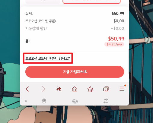 이걸 클릭하면 하면 "프로모션 코드나 쿠폰이 있나요?"라는 문구가 나타납니다.
