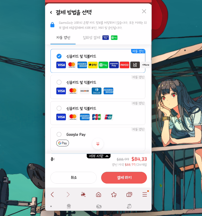 다음 단계는 결제입니다. 신용카드 외에도 카카오페이, 네이버페이 같은 간편 결제도 지원하니 원하는 방법으로 진행하면 됩니다다. 결제가 완료되면, 몇 가지 개인정보를 입력하면 되는데요.